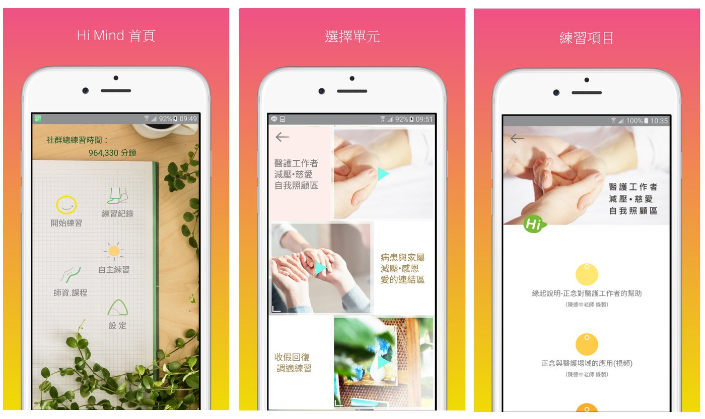 進入動線:Hi Mind 首頁,點選 {開始練習},進入後,找到 {醫護工作者 減壓 慈愛 自我照顧區} ,下述單元是免費可使用的,包含音頻與視頻。