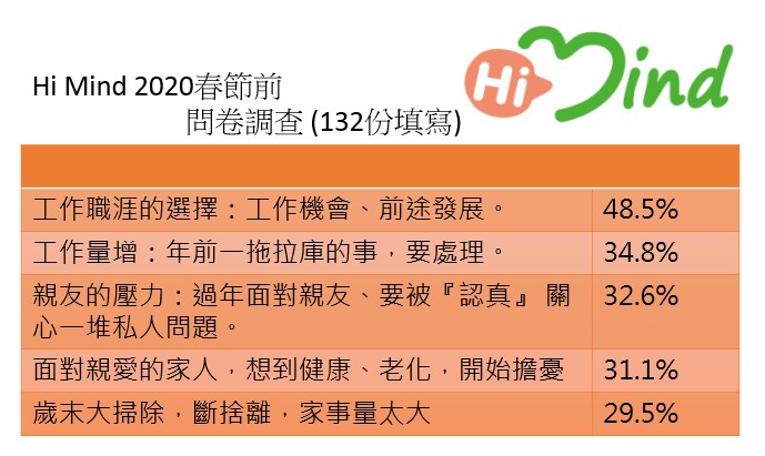 前言:Hi Mind 在2020農曆春節前夕問卷調查,有效回收132份,其中 32.6% 粉絲填寫 『親友的壓力- 過年要面對親友、被關心一堆私人問題。』這篇跟大家分享正念應用方法。