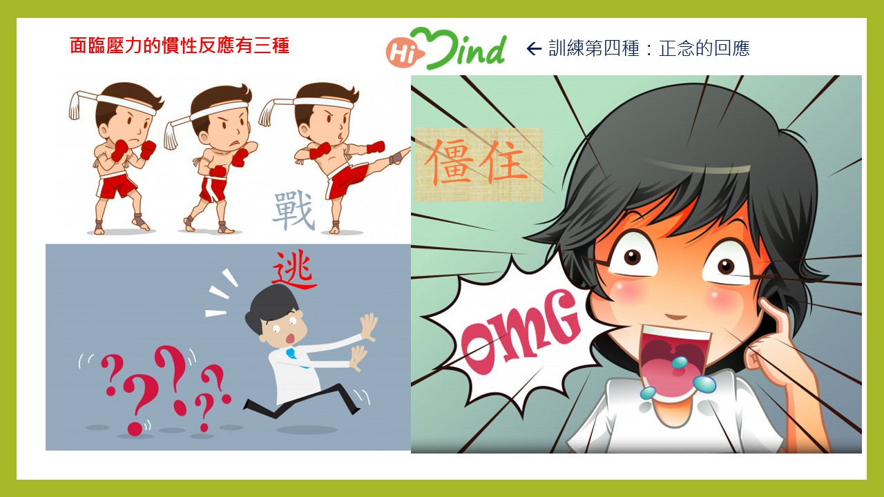 我們遇到壓力,有三種慣性反應:『戰、逃、僵住』,有持續練習正念的朋友們,是有福氣的,因為有第四種的可能性:在當下體驗自己狀態、看看自己怎麼了,然後再帶著正念覺知,決定該怎麼回應讓自己感覺到有壓力的對象。