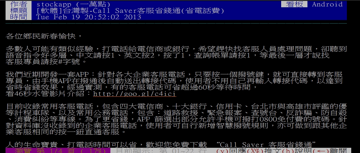 2013年底時候,我們開發一款相當創新且對消費者有幫助的APP:『Call Saver 客服省錢通』。這款APP在當時做過調查美國與中國市場,我們應該是世界首創切入各大企業客服直通真人,可以有效幫消費者節省電話費、與節省時間的作法,跟創業夥伴朝騏討論後,我們判斷推出去會很受市場歡迎。接著就面臨幾個考量,什麼時候要推出去、要怎麼推出去?要免費版還是付費版?
