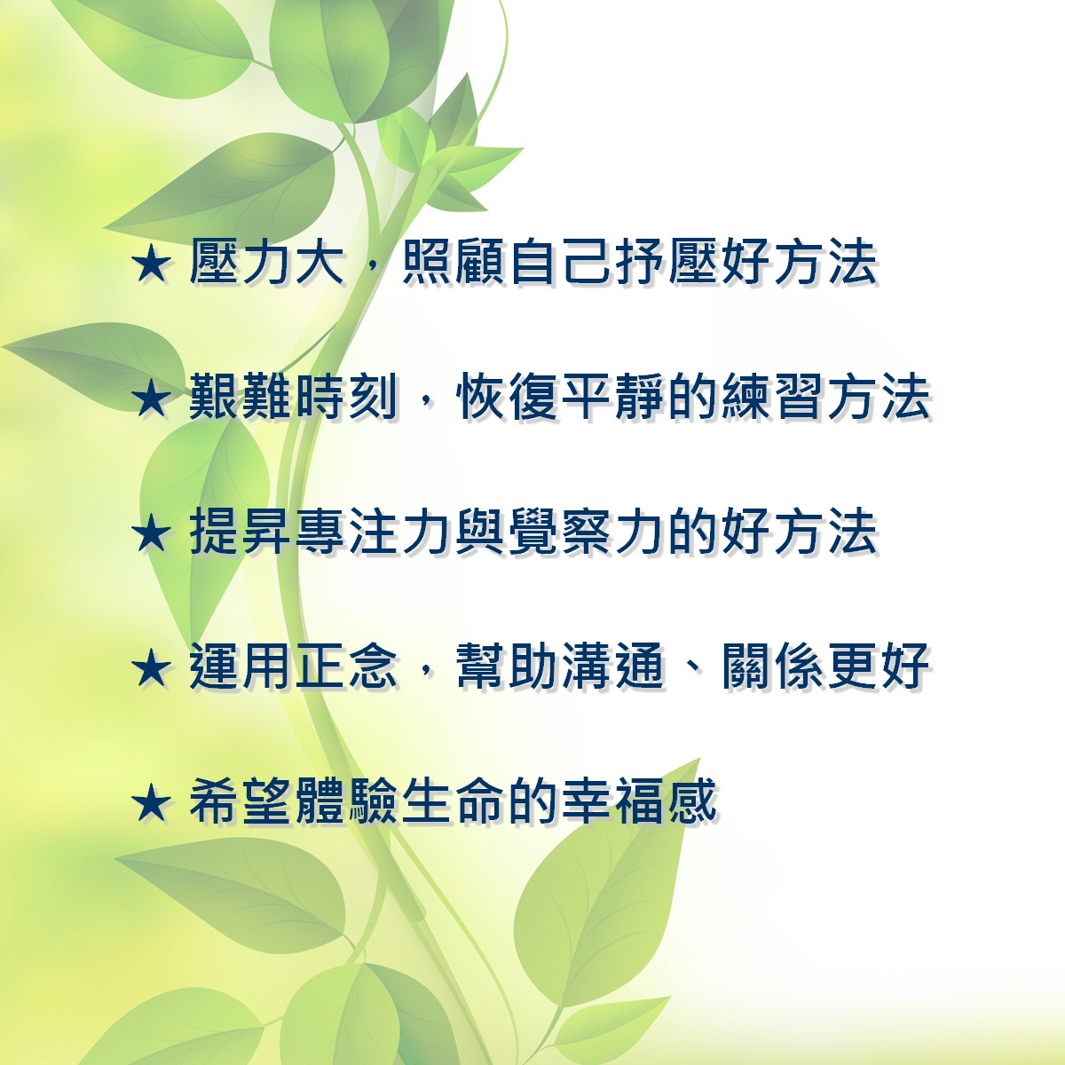現代人壓力大,緊張、焦慮、乃至情緒低落憂鬱等等,有時更想克服問題,反而身心壓力更大。正念的練習,特別著重同在當下的體驗,透過可以直接操作的方法,慢慢學習不評判自己的狀態,進而有能力接納各種可能性。