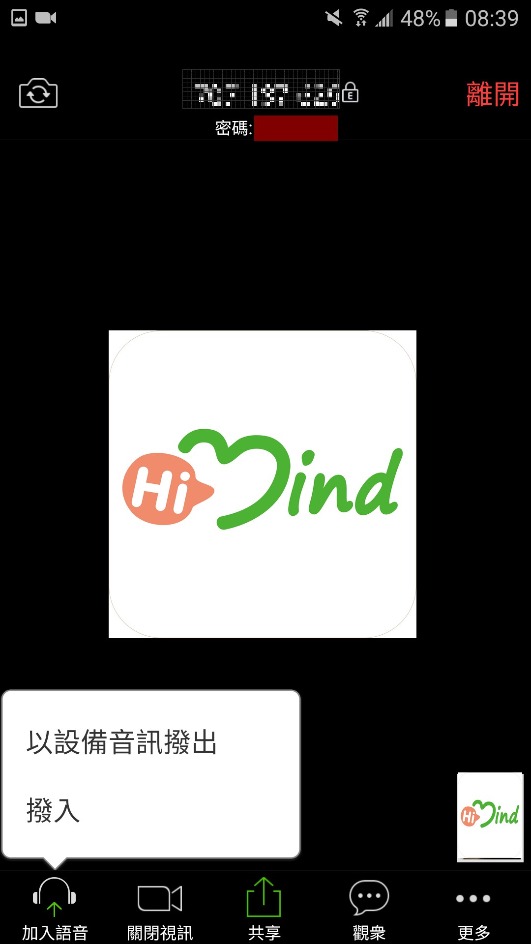 - 開始會議時,主畫面左下角「加入語音」,請點選「以設備音訊撥出」,也就是使用手機上的麥克風意思。