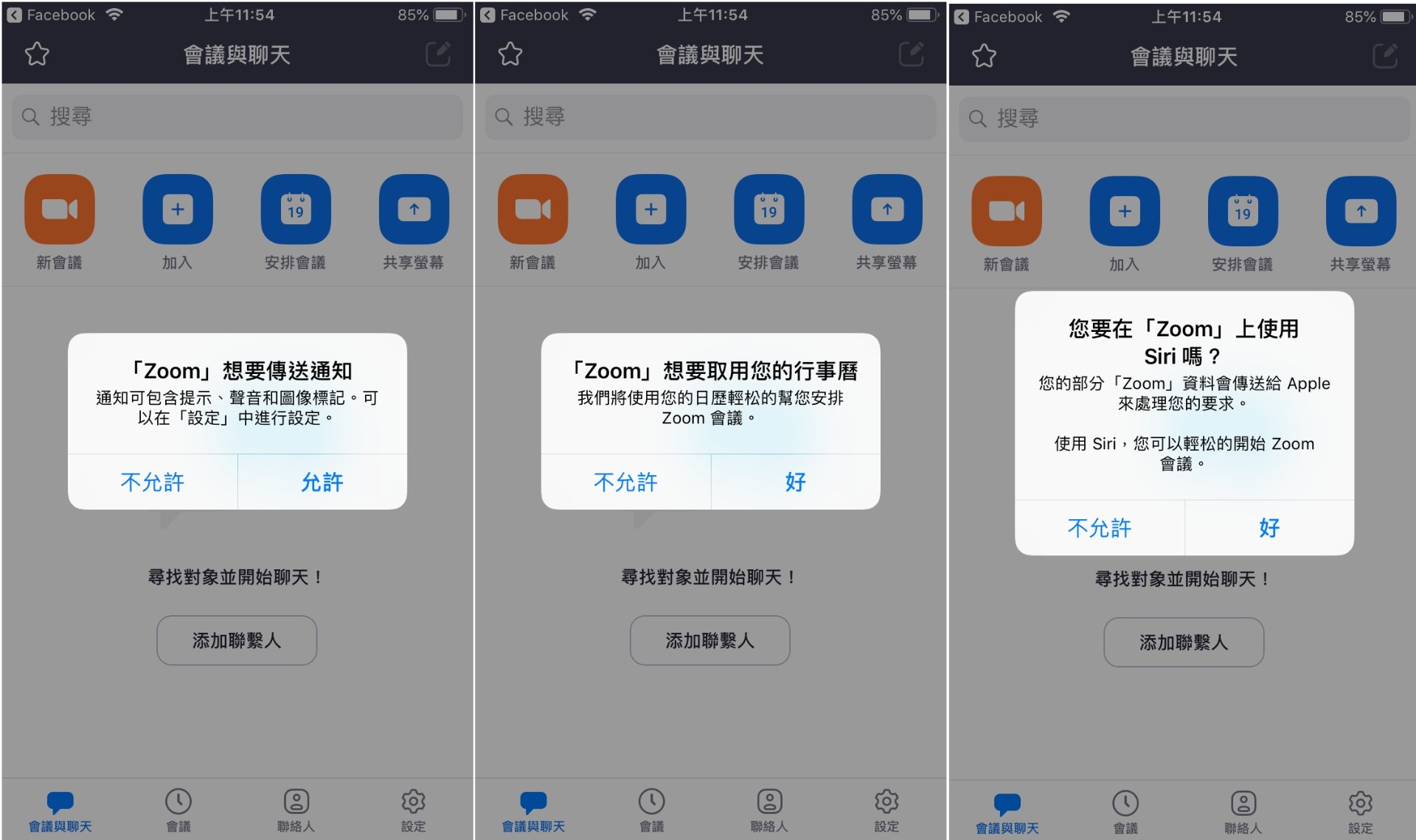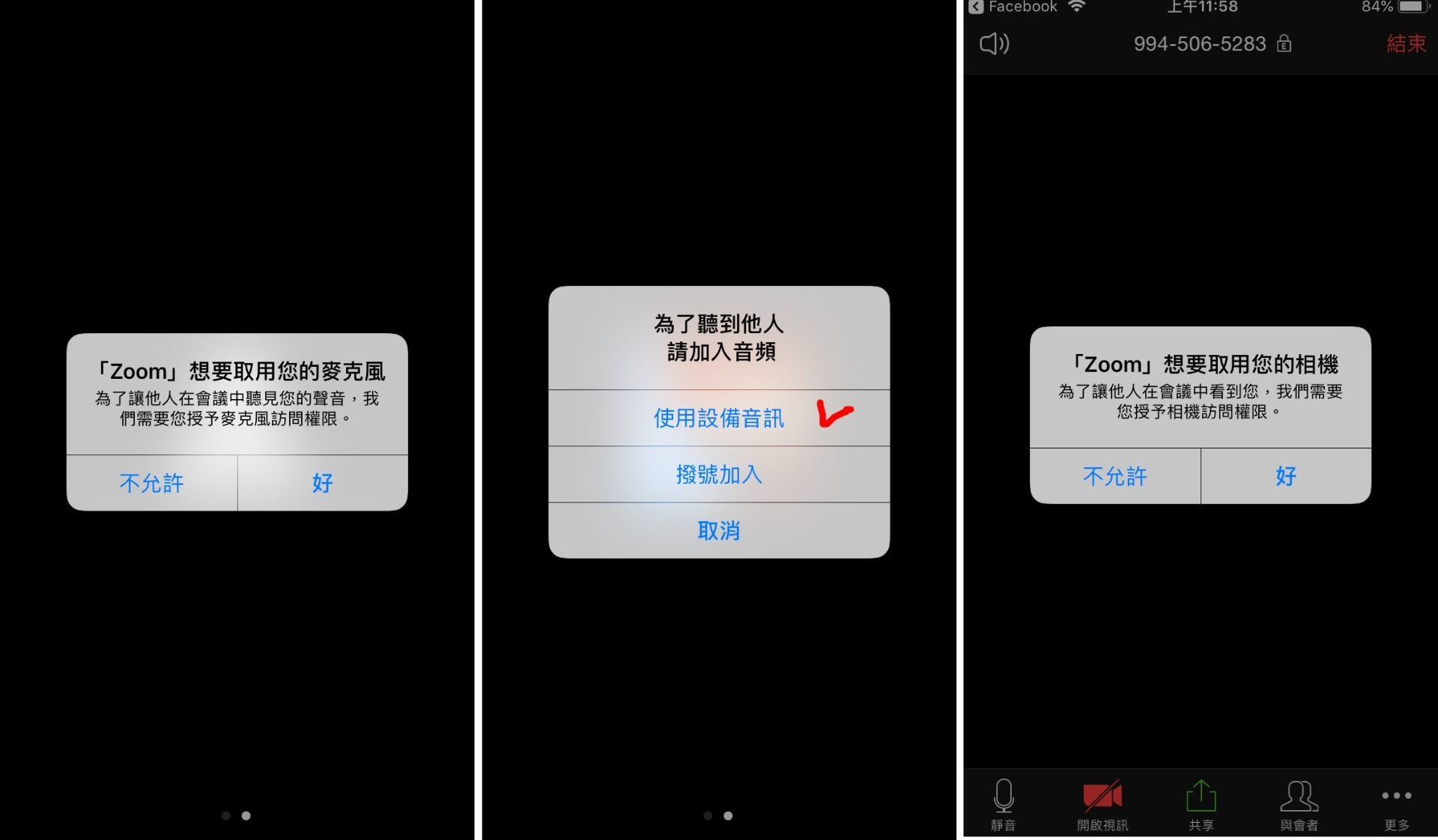 iPhone手機,操作過程,Zoom會詢問要求一些權限,按『允許』或『好』: