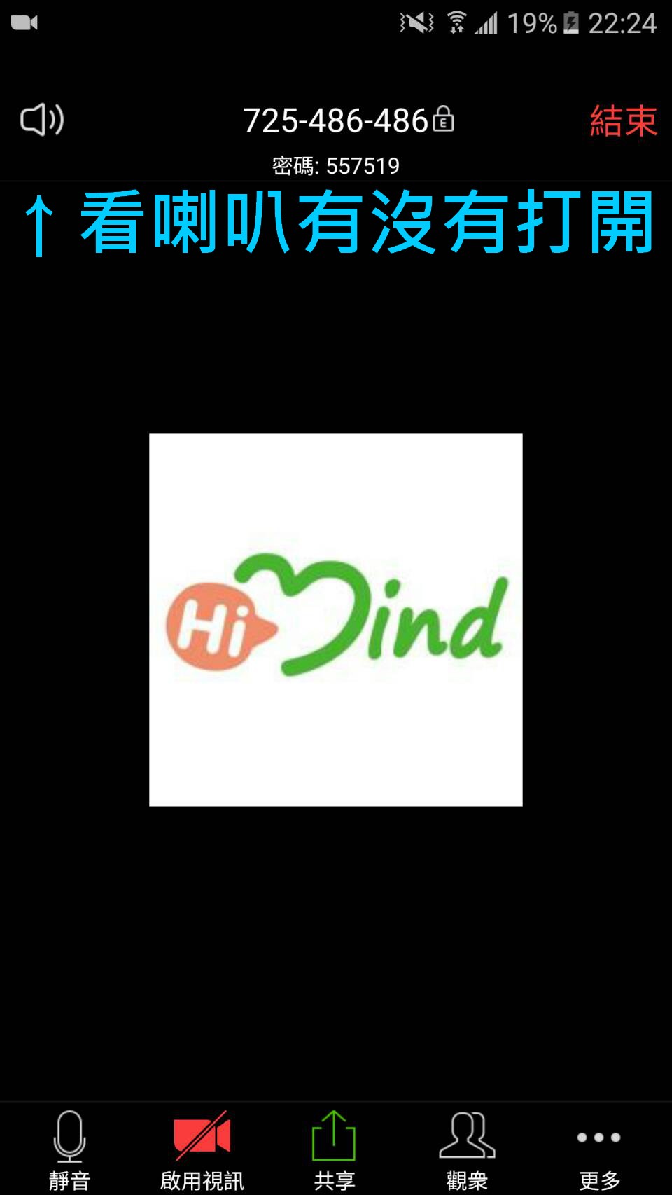 狀況A:請檢查喇叭按鈕,是否被不小心靜音。Zoom 在手機左上角,有一個喇叭的按鈕。如下圖這樣是打開的狀態,就可以聽到會議室別人講話的聲音。