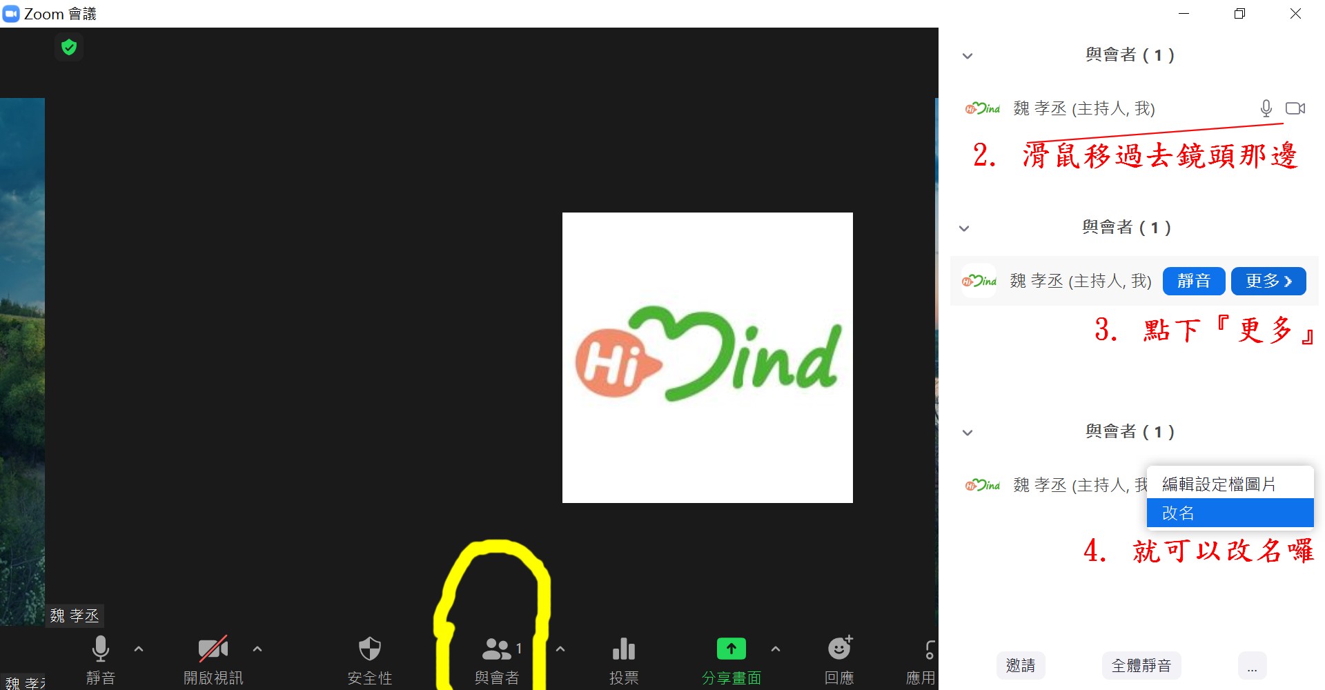 有些付費課程,會要求本人姓名認證。這個請在會議登入前就先改好。或者進入會議後